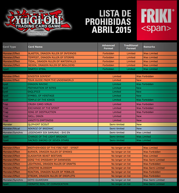 Que tal banda frikispanera, como ya es costumbre cada cierto tiempo a Konami se le ocurre “movernos el piso” con su acostumbrada Yu-Gi-Oh! Lista de prohibidas, en este caso la nueva se llevó a los Dragon Rulers a mejor vida y nos trajo bellezas de la talla de la Crush Card Virus. Les recuerdo, para quienes no lo sepan, que esta lista oficialmente entra en vigor a partir del 1 de Abril y no antes, de forma oficial pueden jugar con su baraja como la tienen hasta el día de hoy hasta que este mes termine, en juego casual sabemos que esto no pasa pues, la mayoría, comenzamos a probar las barajas con los cambios de la nueva lista antes de ponerlas a batallar en torneos.
