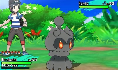 Cuando hace frente a sus rivales usando todas sus fuerzas, su ardiente espíritu combativo hace que partes de su cuerpo adquieran una tonalidad verdosa. Robasombra es un nuevo movimiento exclusivo de Marshadow que roba los aumentos en las características que pudiera haber experimentado el rival para luego lanzar un ataque. Se trata de un potente ataque físico con un efecto sorprendente.