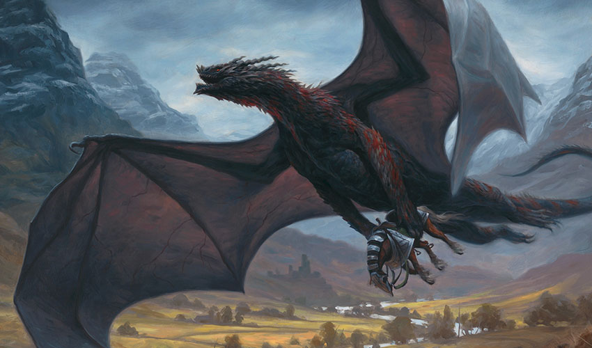 Abre sus alas, dejando que el sol seque la humedad que persiste en sus escamas todavía suaves. Estirando su cuello flexible, estudia el paisaje. La gran sombra ondula a través de una extensión de bosque y pastizales hacia una cadena de montañas distantes. La luz del sol vuelve detrás de su pasaje, dorando la escena con colores vivos.