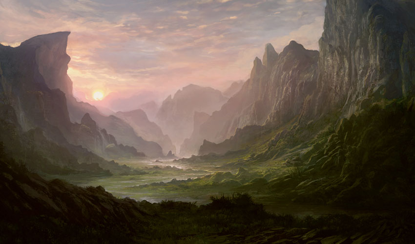 Ugin no responde. Él mira todo el paisaje. El mundo no es nuevo, pero son nuevos, como niños cuyos ojos no pueden comprender completamente lo que ven: bosque verde, llanuras cubiertas de hierba de color amarillo verdoso, los hilos de plata de los ríos serpentean a través de una amplia meseta. Todo tipo de criaturas deambulan por este ancho mundo. Todo espera a ser descubierto. Ugin levanta su mirada hacia arriba y por mucho tiempo mira al cielo arriba.