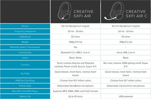 | SXFI AIR Los SXFI AIR se conectan indistintamente vía Bluetooth y USB a numerosas plataformas que van desde dispositivos móviles hasta PC y Mac, pasando por Nintendo Switch y PS4. Los usuarios podrán personalizar sus perfiles de audio a través de una aplicación para móviles y subirlos a sus SXFI AIR. La versatilidad de los SXFI AIR también destaca por su conectividad inalámbrica, otorgándole una alta compatibilidad con dispositivos iOS y Android. Cuando se conectan mediante USB, los SXFI AIR ofrecen un audio envolvente 7.1 de baja latencia, perfecto para películas y videojuegos, sobre todo en PC y Mac. Los auriculares SXFI AIR también pueden usarse como un reproductor de música independiente al insertarle una tarjeta microSD. Tienen compatibilidad con los siguientes formatos: MP3, WMA, WAV y FLAC. Además, los SXFI AIR llegan con un control táctil en el auricular, con el que usuarios podrán cambiar de canción o ajustar el volumen con un simple toque. Los SXFI AIR cuentan con orejeras cubiertas con un tejido de malla y rellenas con espuma de foam para mayor comodidad, ya que estos materiales son muy transpirables, su espuma disipa el calor con más facilidad, cuentan también vienen con unos aros de luces RGB personalizables, que permiten al usuario elegir entre 16 millones de colores para hacer sus auriculares verdaderamente únicos. SXFI AIR C (para gamers) Los SXFI AIR C son los primeros auriculares USB diseñados para jugadores que cuentan con Super X-Fi. No tienen Bluetooth, ni control táctil, ni ranura para tarjeta microSD. Han sido diseñados para mejorar la experiencia de juego. Los SXFI AIR C cuentan con un micrófono desmontable ClearComms que ha sido afinado específicamente para reproducir fielmente el tono de voz natural, permitiendo una comunicación clara y nítida con tus compañeros de equipo o amigos. El micrófono ClearComms también está disponible para los auriculares SXFI AIR. |